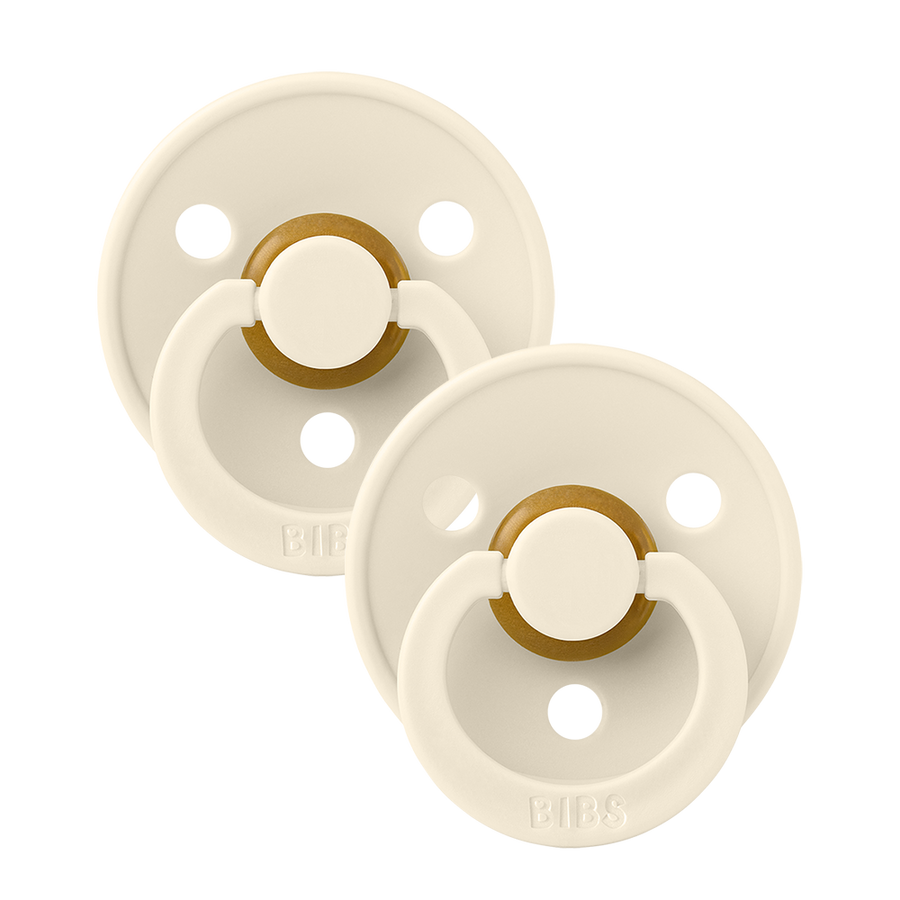 Our Colour pacifier is the original BIBS pacifier and has been on the market for over 40 years. It has the signature round BIBS shield with three vent holes and round BIBS engraved handle ring.