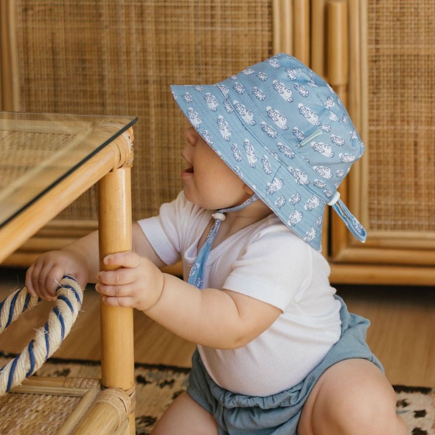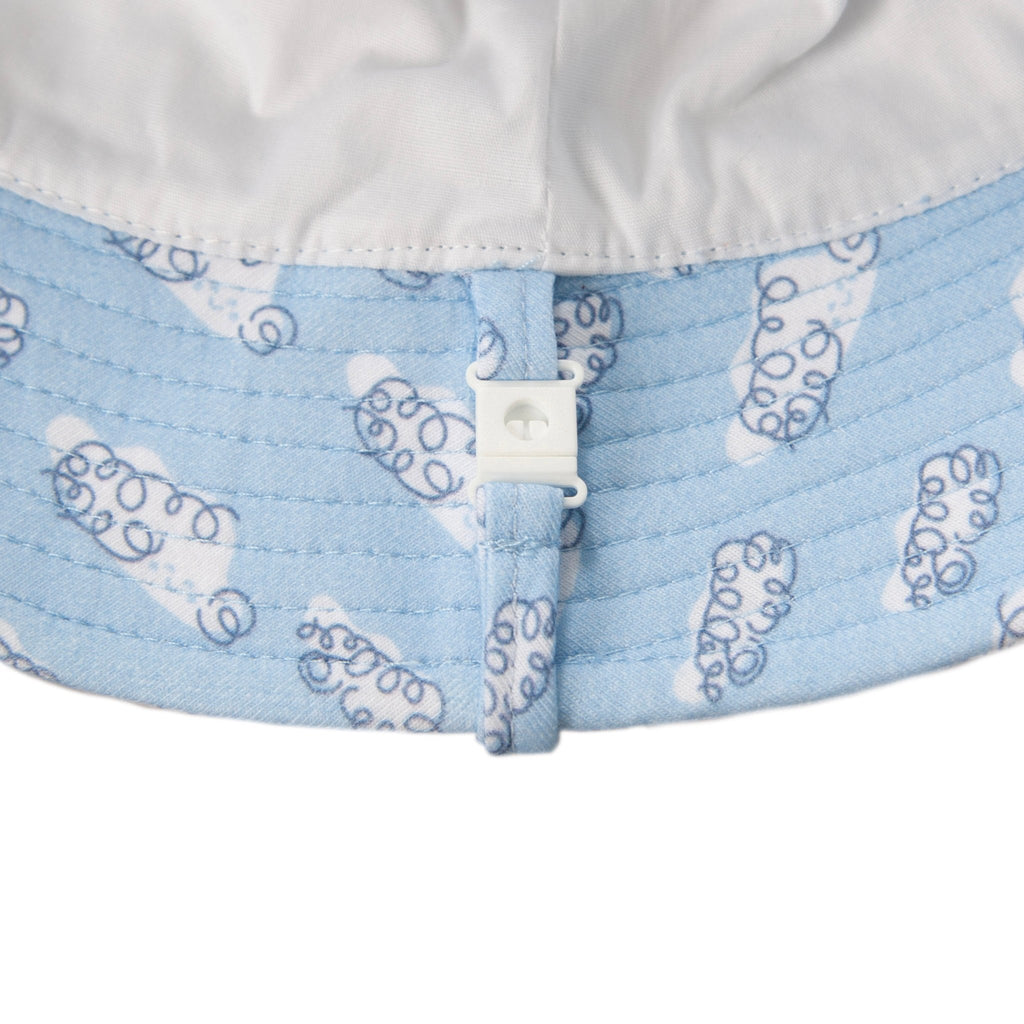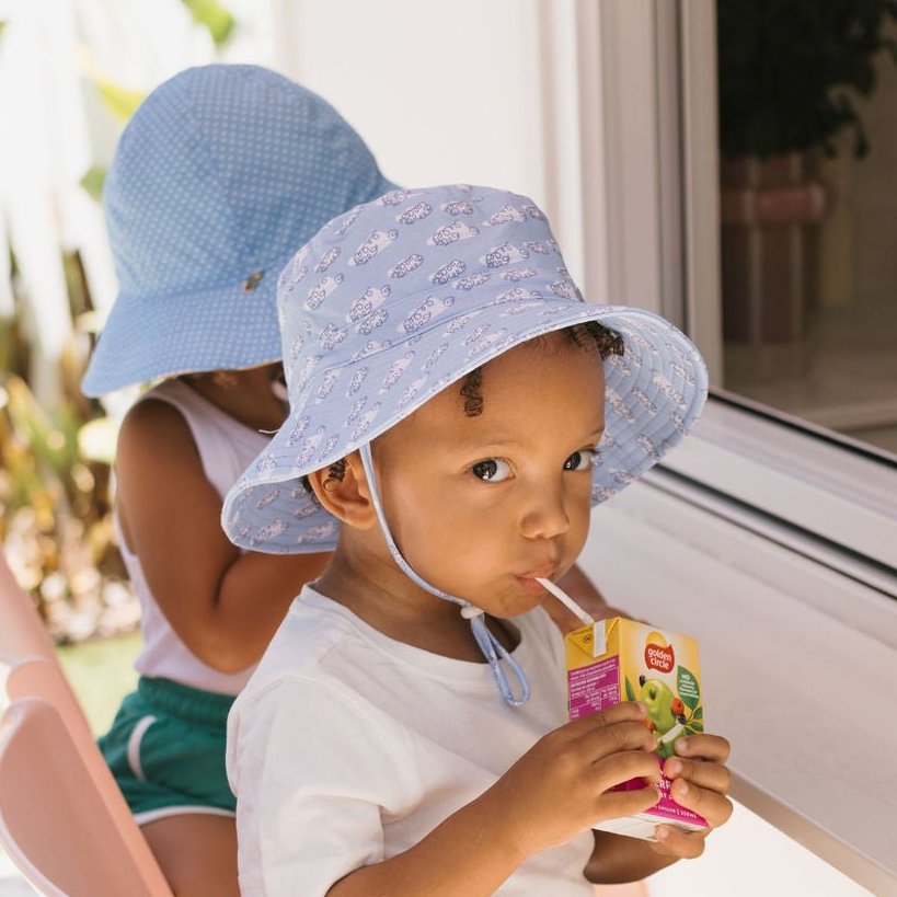 This soft bucket hat with a blue and white fluffy clouds print is a dreamy way to keep little ones sun-safe this summer. The original print was created by Melbourne artist Jacinta Weir from Two Little Ducklings.