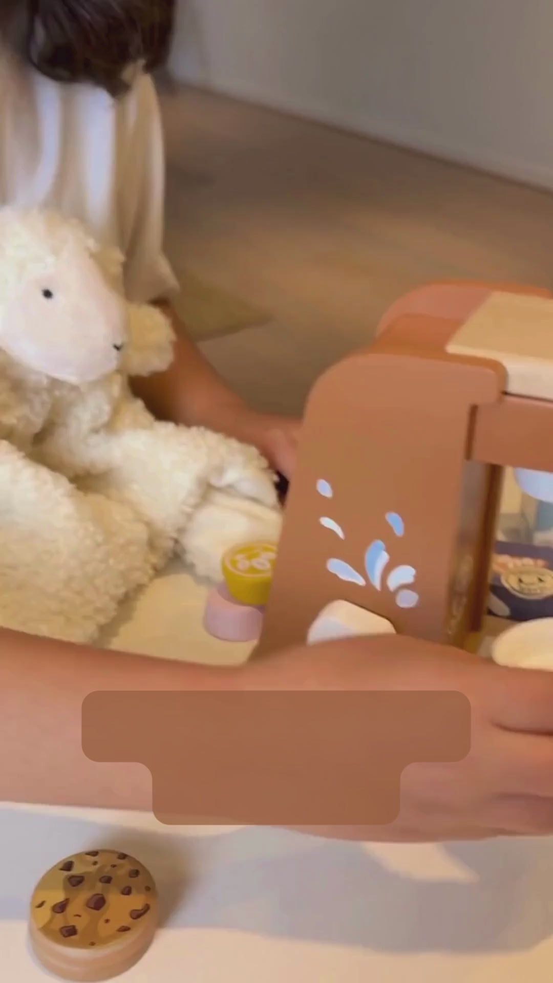 Includes wooden coffee machine, cup, coffee pods, milk, cookies and spoon