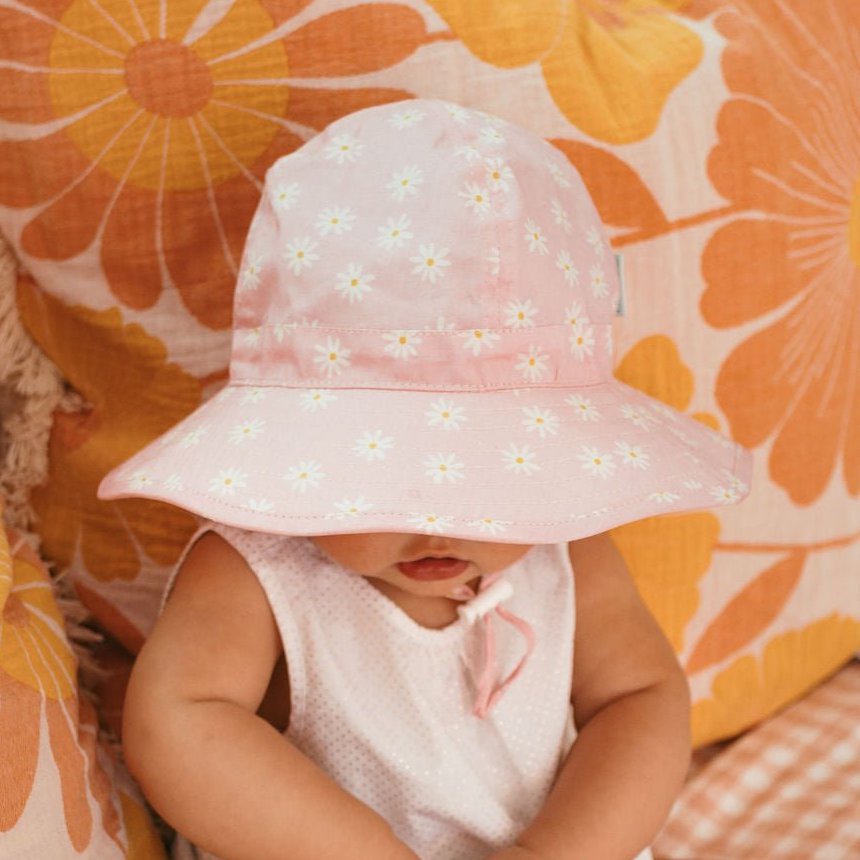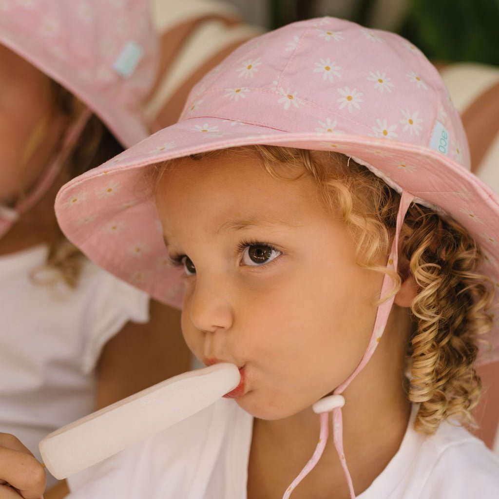 Perfect for sunny days at the park, beach, or backyard adventures, this wide brim sunhat features a sweet pink daisy print, designed by Jacinta Weir from Two Little Ducklings.