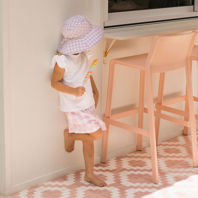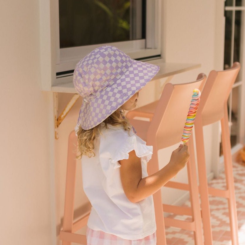 Bucket hat with a gorgeous lavender and cream checks design on the outside and on the inner brim.