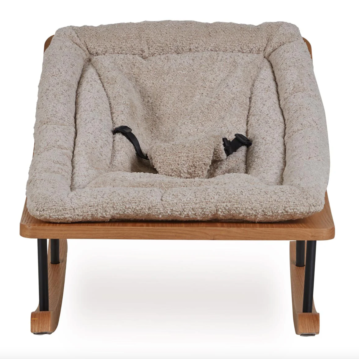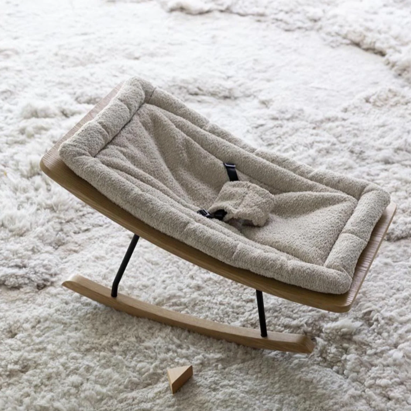 This stunning Rocking Baby Bouncer by Quax is the perfect place for new babies to comfortably relax, nap and play. The stylish design is made with quality in mind and features solid birch runners, lightly textured fabric and beautiful colours.