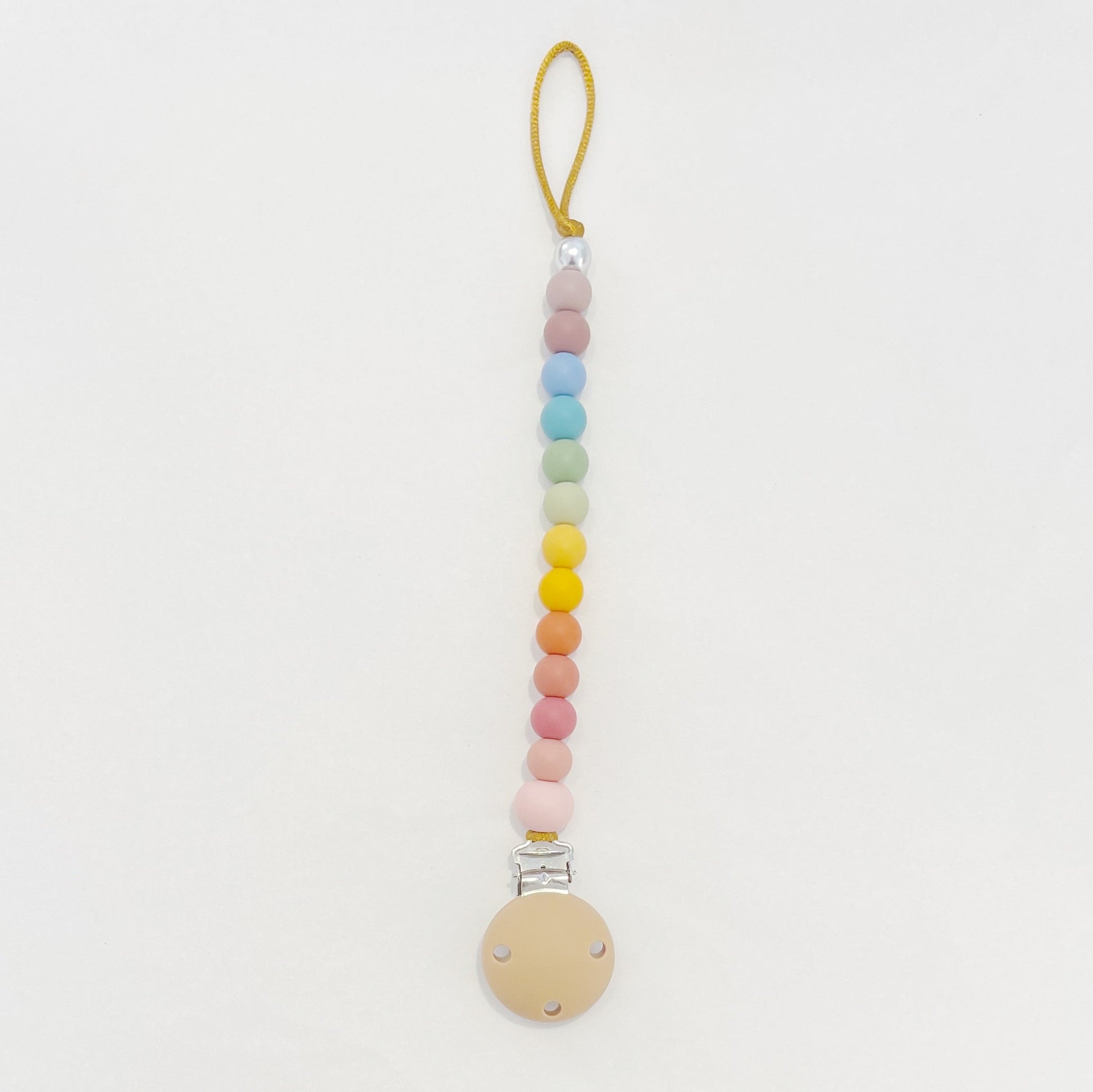 Made with silicone beads on a tough bronze coloured satin nylon cord, our Dummy Clips are perfect for drooly, grubby bubs - simply wipe with a damp, lint-free cloth or a baby wipe and you’re good to go! The end bead is a sturdy metal bead that ensures the silicone beads can’t be pulled over the knot (unlikely but as silicone beads are very stretchy, it could happen). Our design has been laboratory tested and certified so you can rest assured you are purchasing the best for your baby.