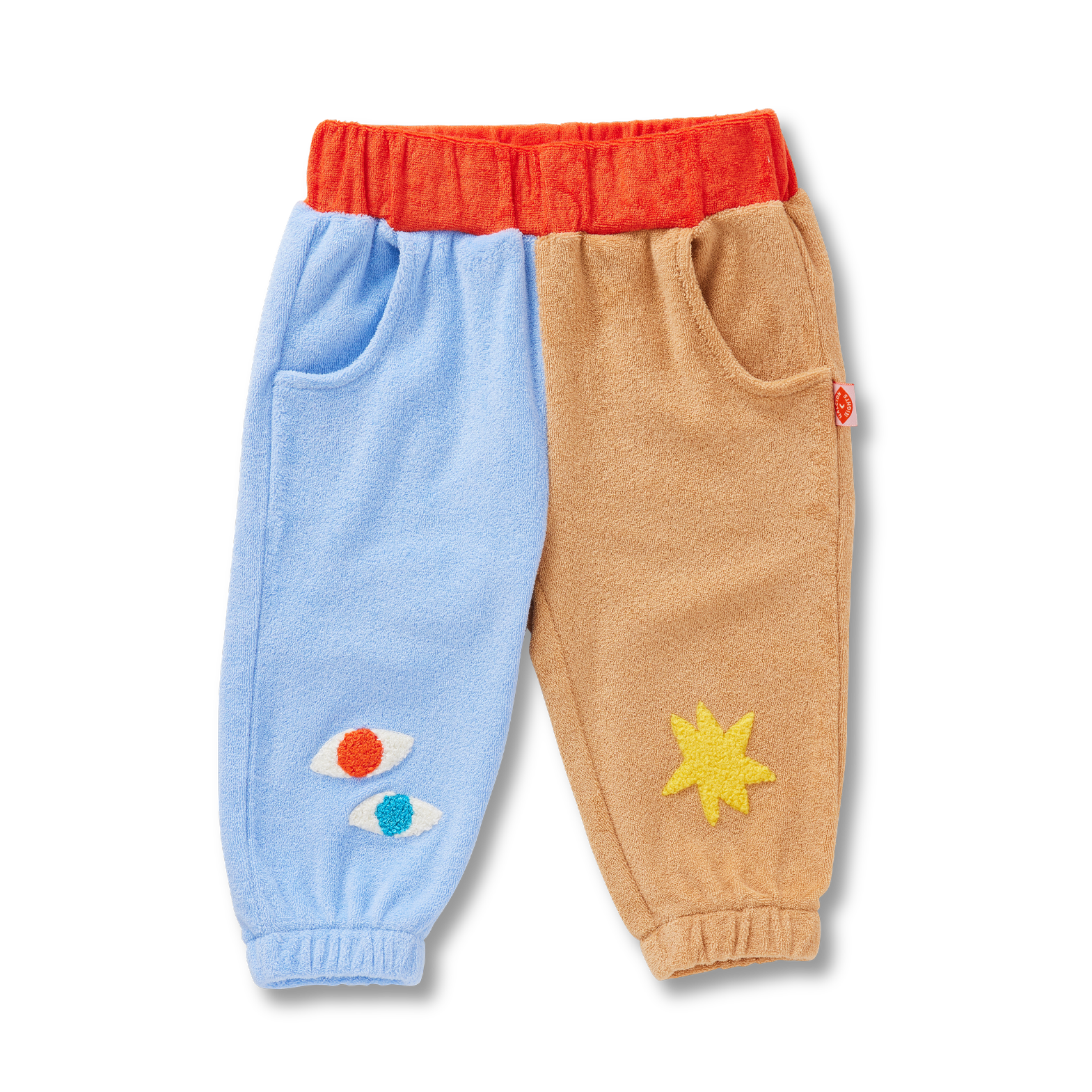 Let's roll! Lounge about or get active in this comfy and durable colour block terry towelling track pants. Features cute Space Blue boucle applique knee patches.