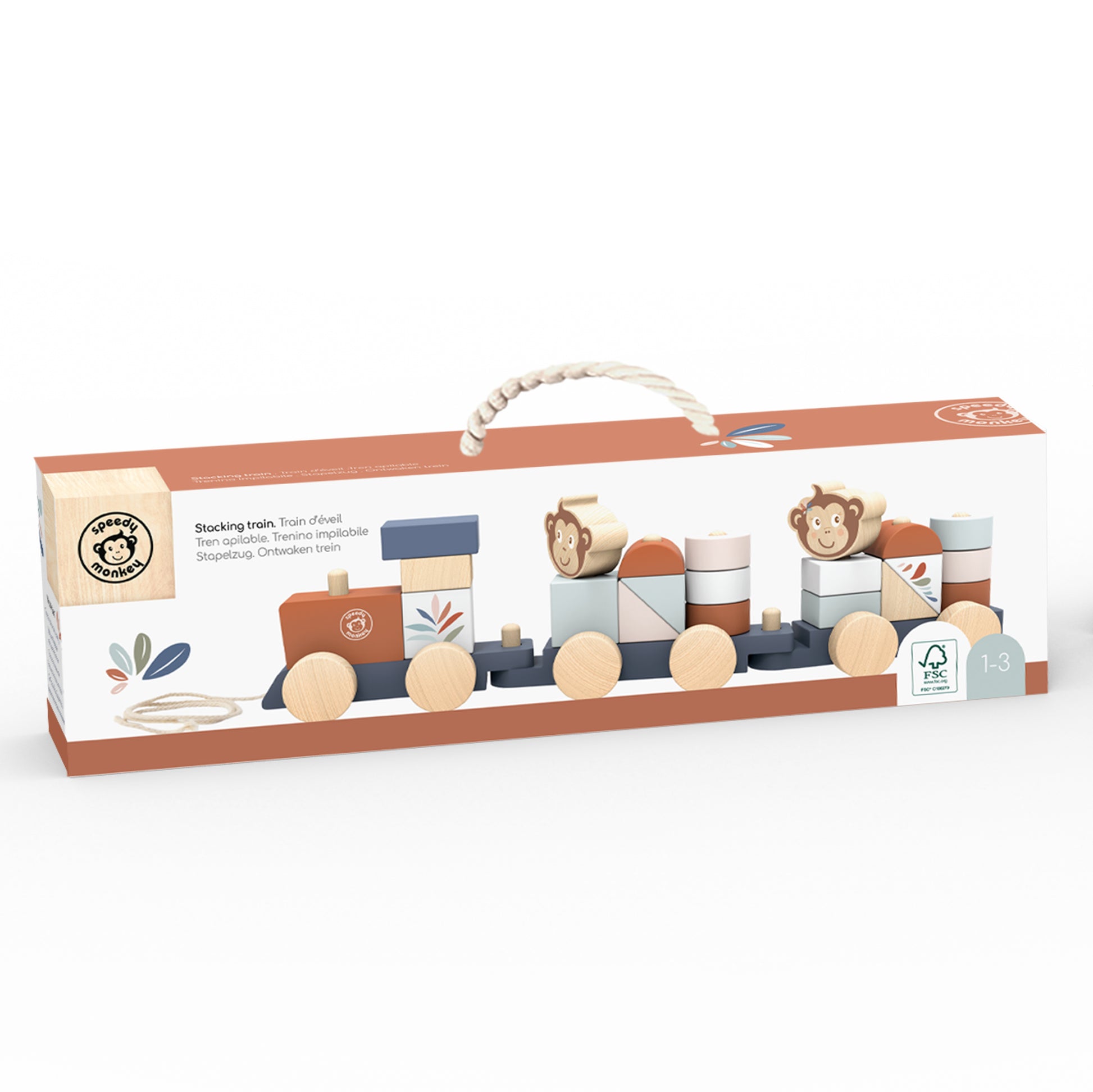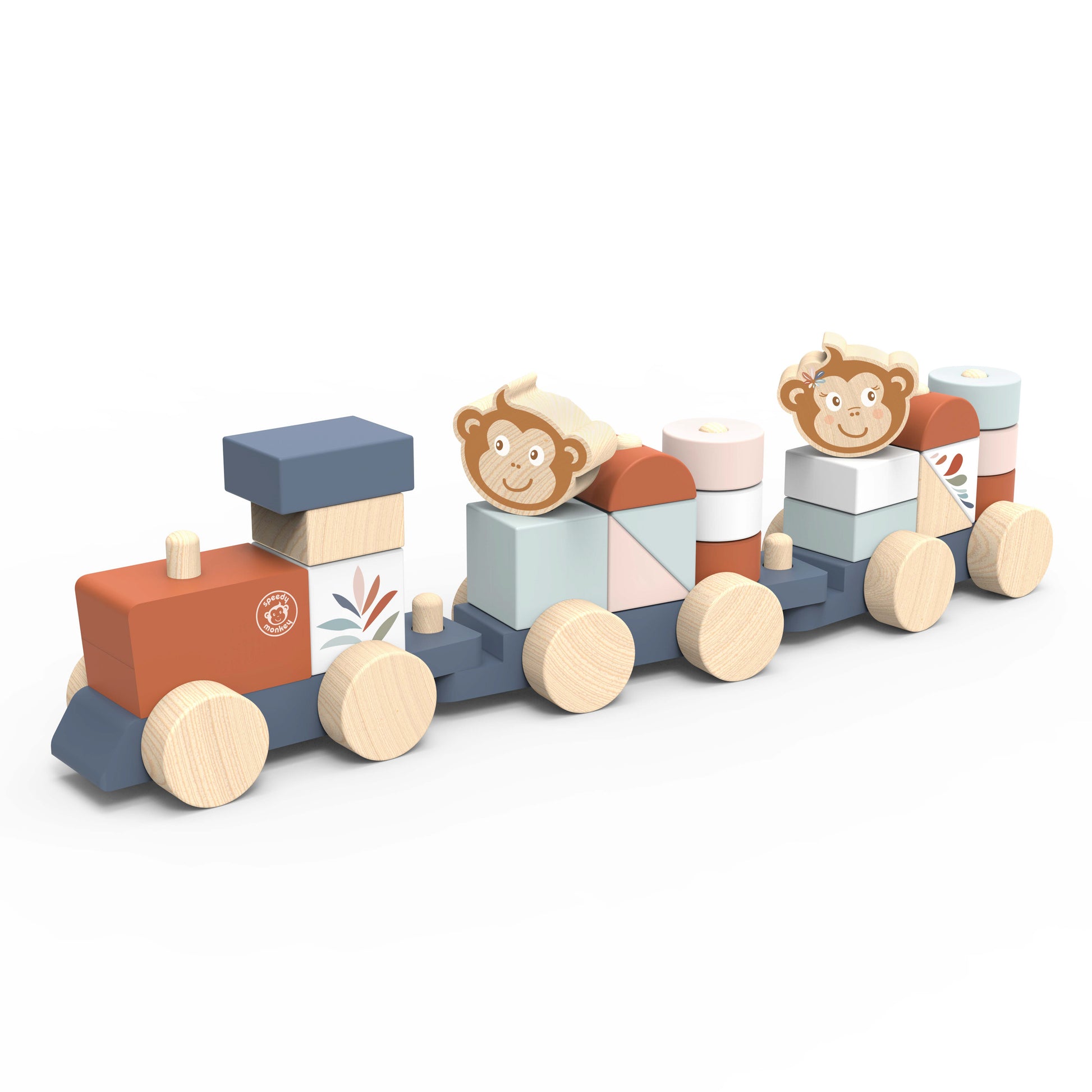 A fun wooden pull-along train stacker, painted in trending soft colours and featuring our favourite character, the monkey. Your little one will have hours of fun, stacking elements on the train and building houses with colourful blocks. Once all aboard, the choo choo train departs for a new adventure! This toy is crafted from sustainably sourced wood from FSC® certified forests and coated with non toxic paint.