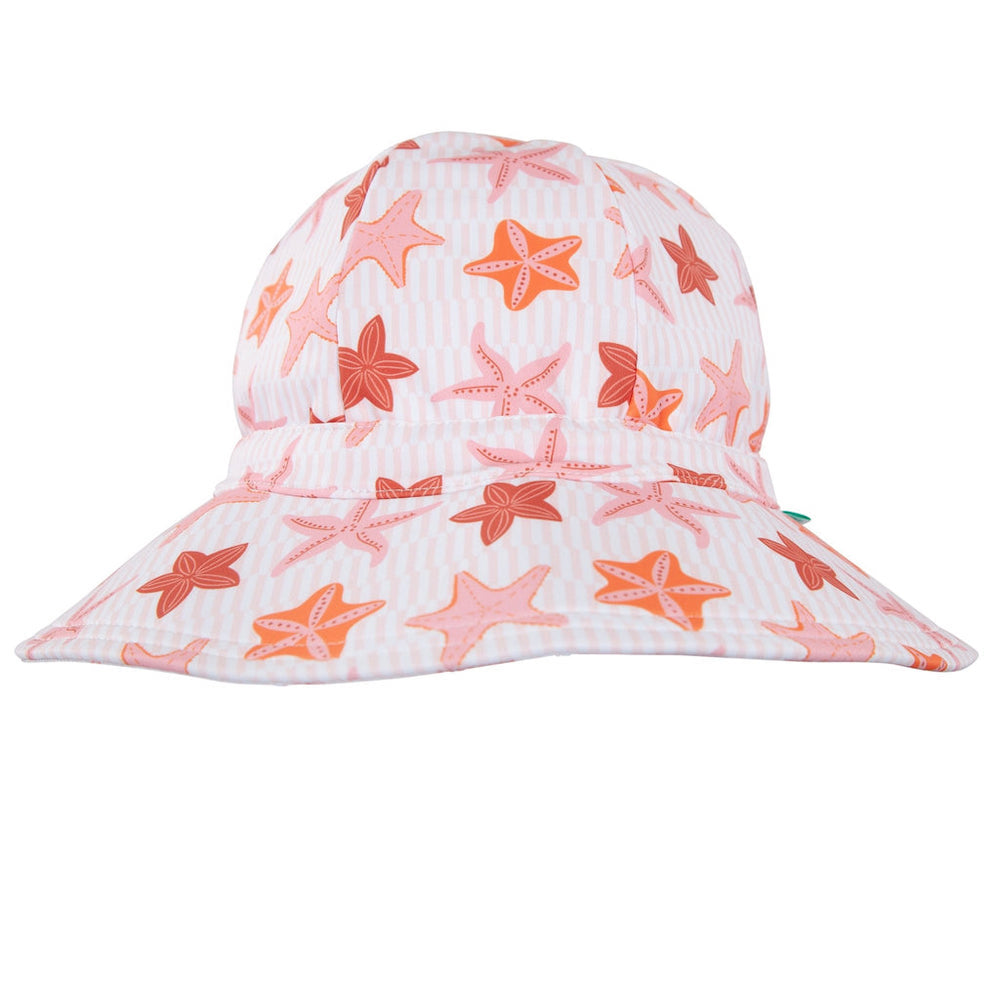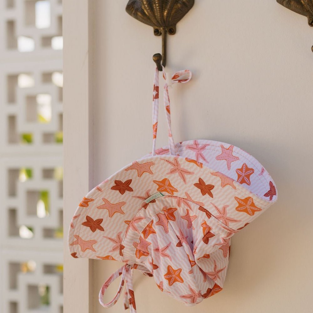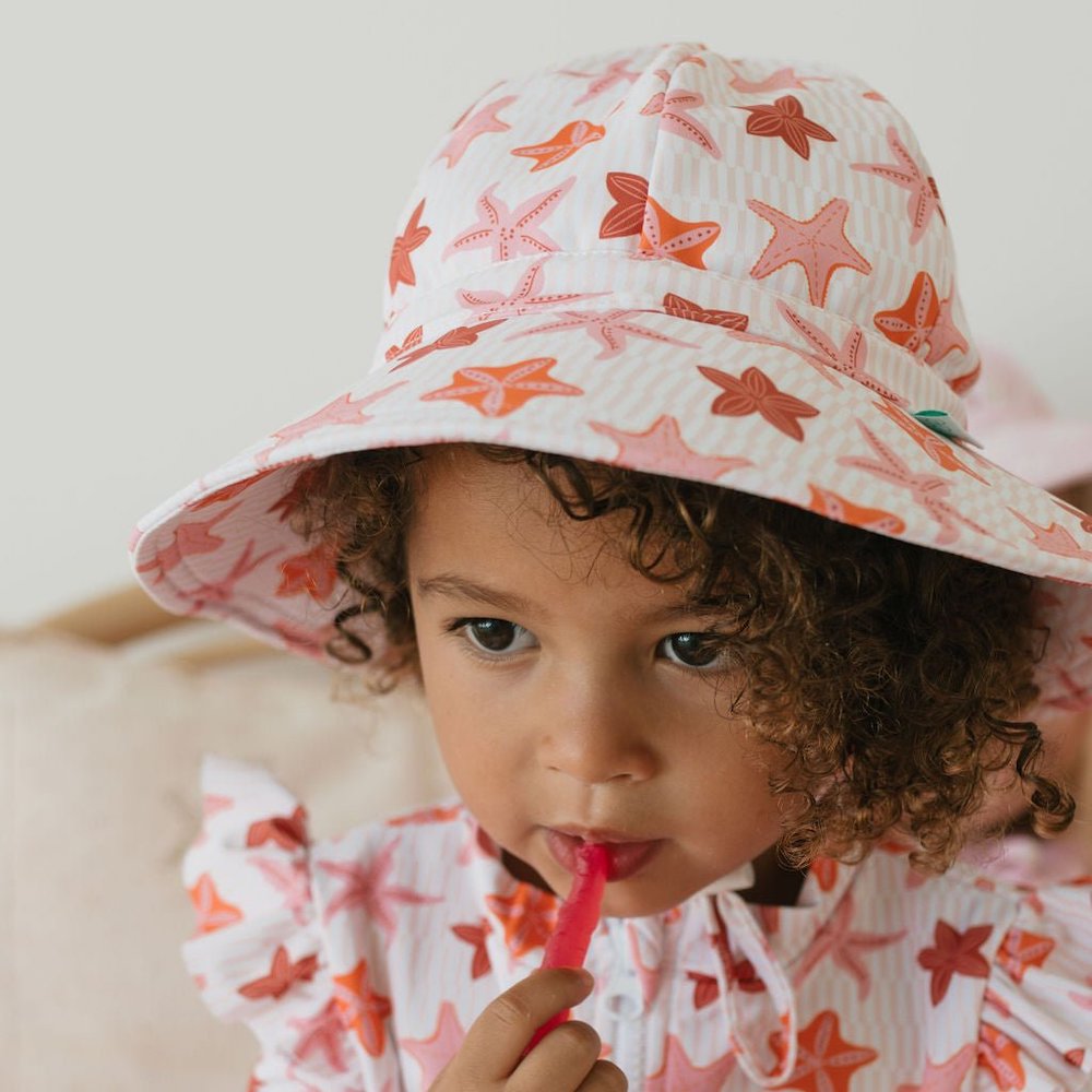 Dive into summertime fun with the Starfish Wide Brim Swim Hat, featuring a gorgeous pink, orange, and red starfish print designed by Jacinta Wier from Two Little Ducklings.