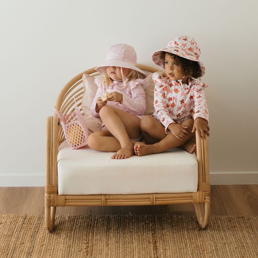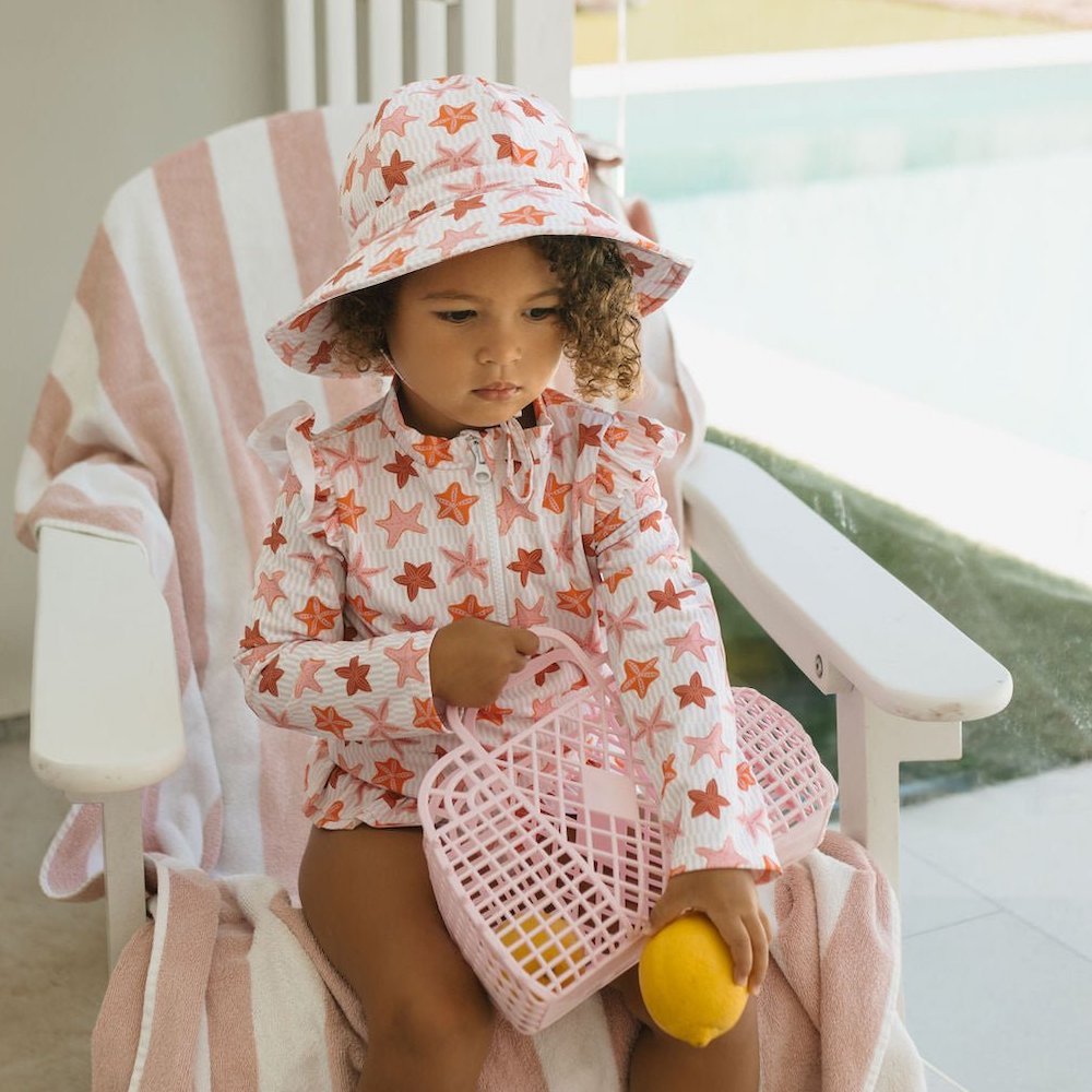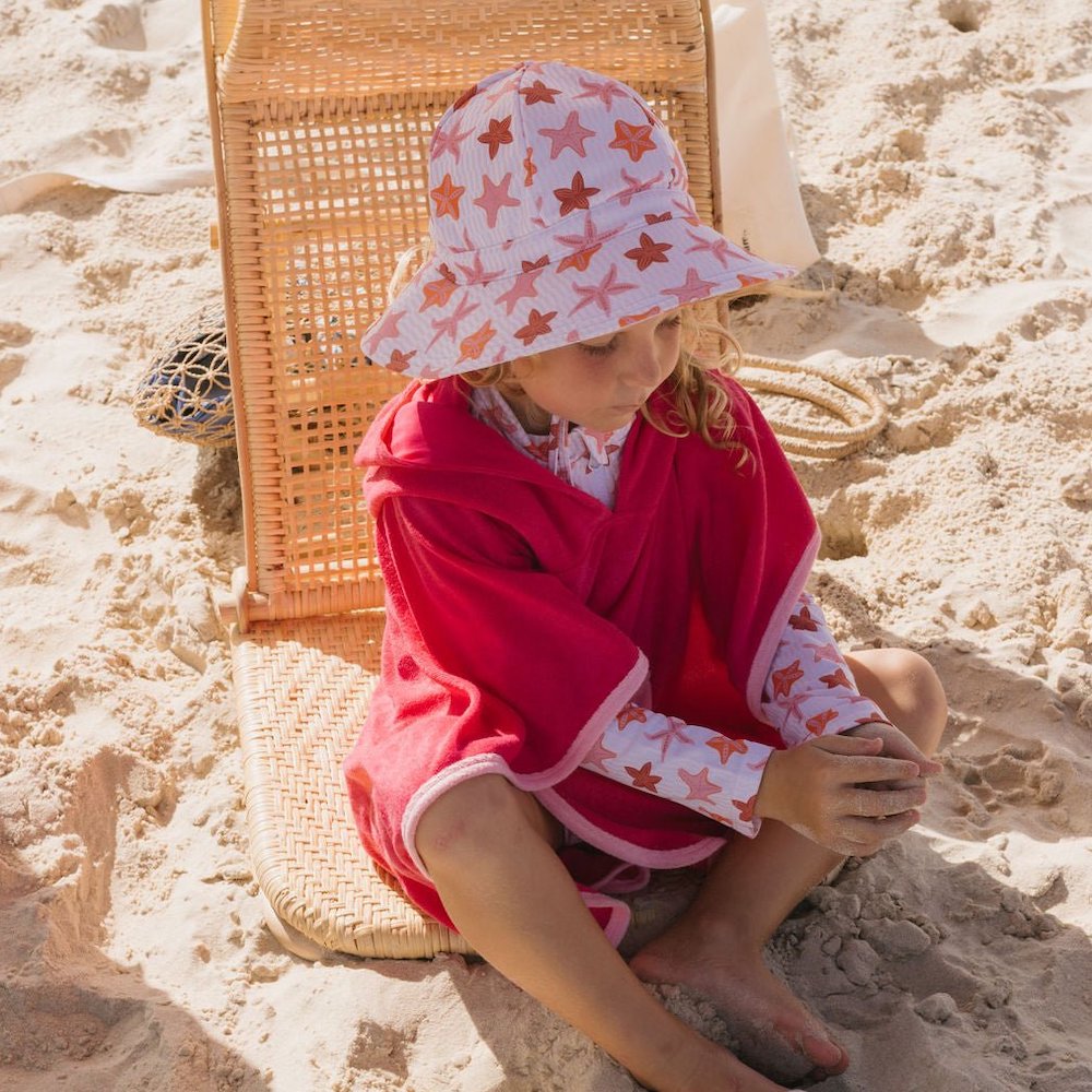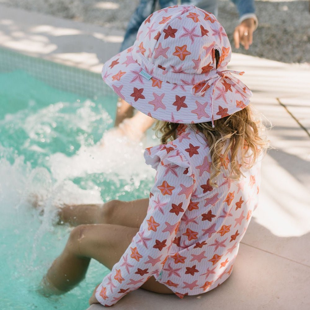 Dive into summertime fun with the Starfish Wide Brim Swim Hat, featuring a gorgeous pink, orange, and red starfish print designed by Jacinta Wier from Two Little Ducklings.