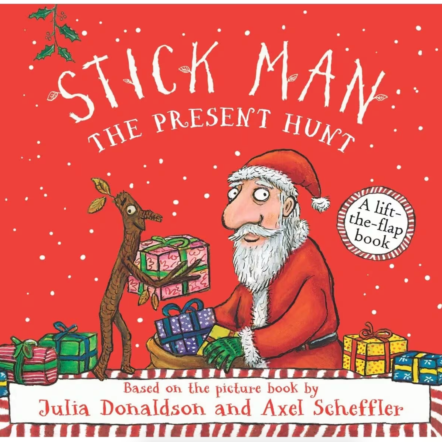 Join Stick Man and Santa on their search for the missing Christmas presents! Stick Man is helping Santa deliver the Christmas presents. But the presents have gone missing. Let's find them! Lift the colourful card flaps in this fun board book, perfect for small hands.