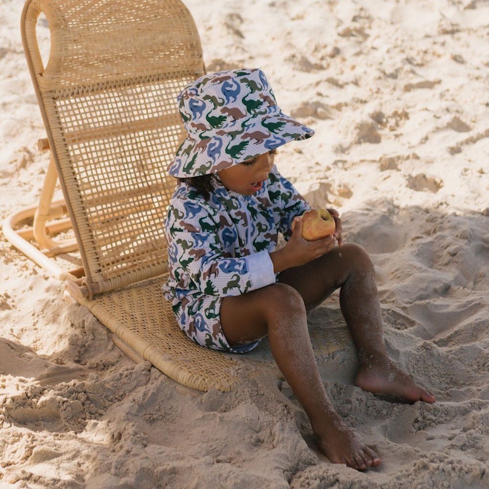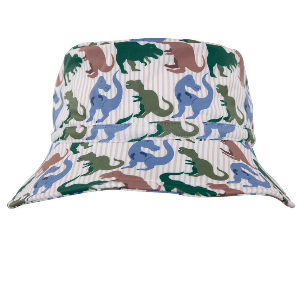 Roar into summer fun with the T-Rex Wide Brim Swim Hat, featuring a playful T-Rex dinosaur print designed by Jacinta Weir from Two Little Ducklings.
