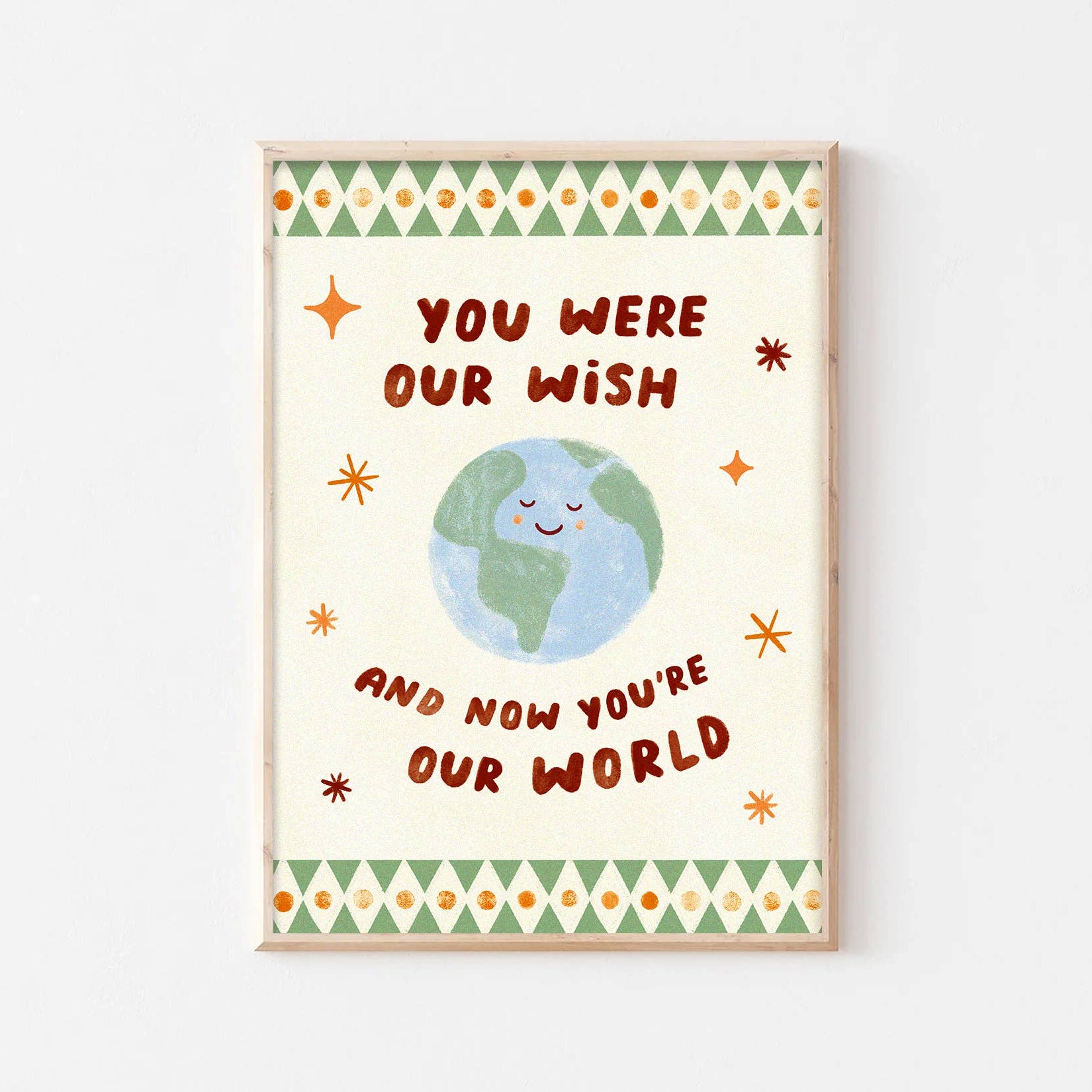 “You were our wish, and now you’re our World” - a sweet little message for the biggest kind of love. With a smiling World, soft neutral tones and a playful diamond border, this print is designed to celebrate the joy of welcoming a little one into your life.